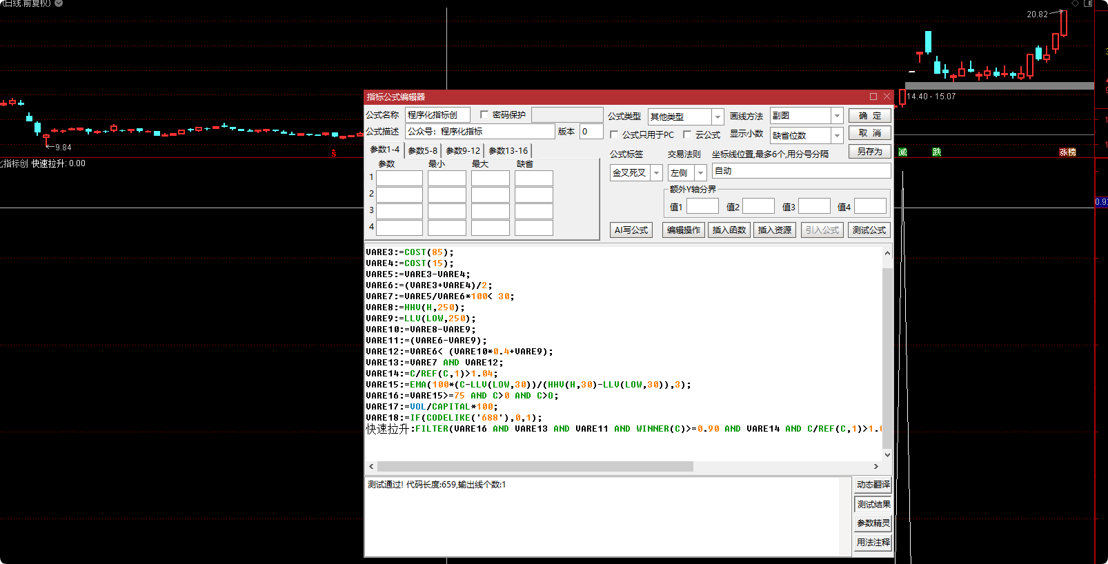 快速拉升:FILTER(VARE16 AND VARE13 AND VARE11 AND WINNER(C)>=0.90 AND VARE14 AND C/REF(C,1)>1.092 AND C=H AND C< 40 AND VARE18 AND VARE17< 20,10);