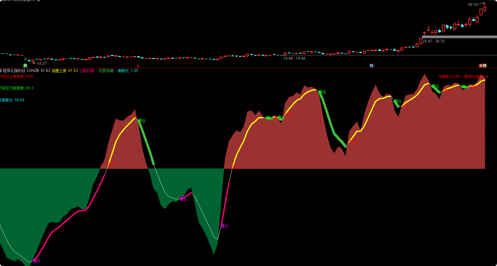 DRAWTEXT_FIX(1,0.88,0,0,'☆微信公众号:(程序化指标) ☆'),COLORRED;