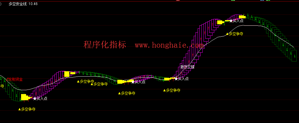 DRAWTEXT(CROSS(VAR6,VAR7) AND VAR7<VAR8,VAR3*0.95,'▲多空争夺'),COLORYELLOW;