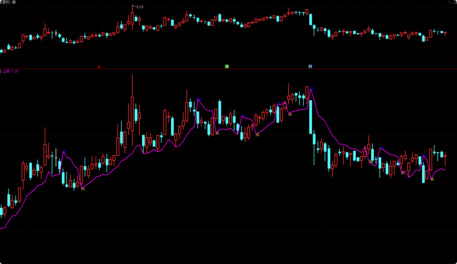 止损:IF(0>=Y2,NN,TT),COLORFF00FF,LINETHICK2;