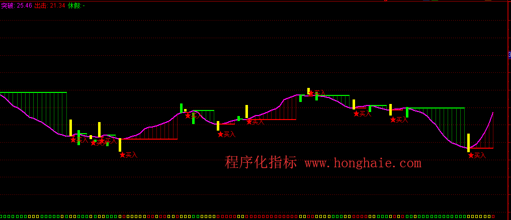 STICKLINE(A1X<0,休假,突破,0,-1),COLORGREEN;