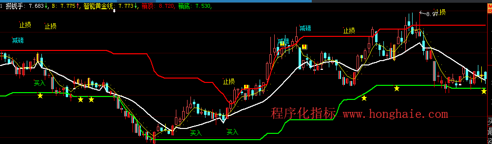 STICKLINE(买进条件 AND 捞钱手>智能黄金线 AND 智能黄金线>REF(智能黄金线,1),L,L*0.998,7,0),COLORWHITE;