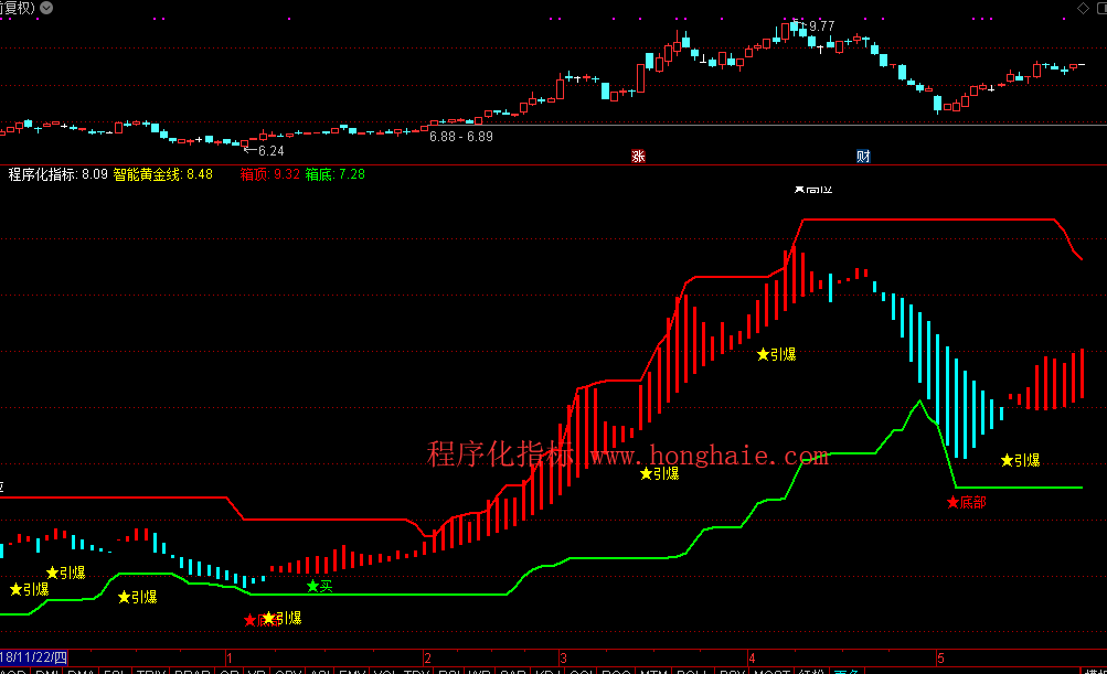 箱顶>=REF(箱顶,1),LOW*0.95,'★引爆'),COLOR00FFFF;