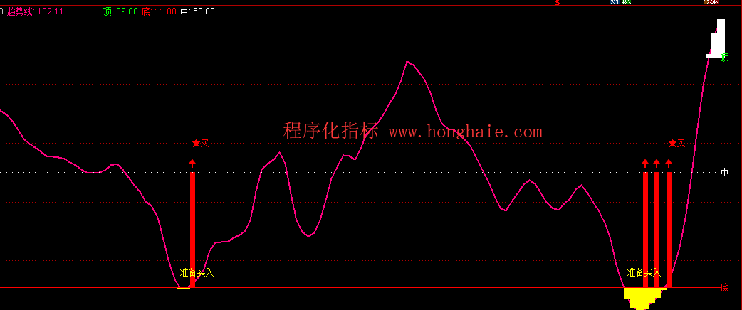 DD0:=REF(趋势线,1)>89 AND CROSS(89,趋势线) AND C>中线;