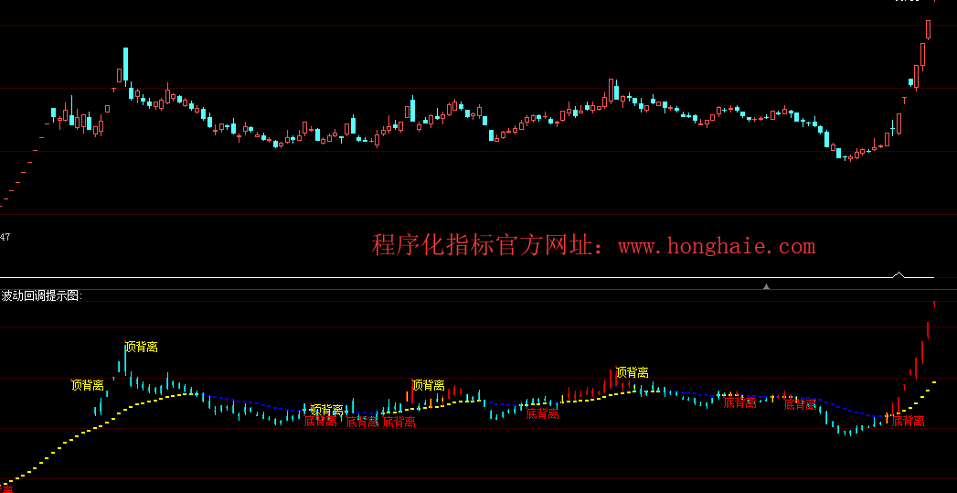 DRAWTEXT_FIX(C>O,0.01,0.9,0,' 微信公众号:程序化指标 网址:WWW.HONGHAIE.COM '),COLORRED;