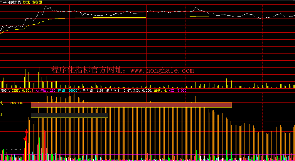 STICKLINE(C=REF(C,1) and v>ref(最大量,1) and time>94200,0,VOL,5,0),COLORwhite,LINETHICK2;