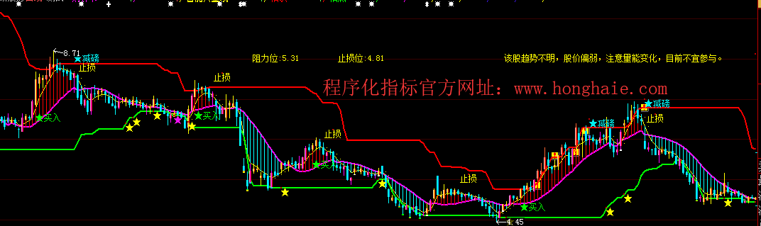 DRAWTEXT_FIX(C>O,0.01,0.9,0,' 微信公众号:程序化指标 网址:WWW.HONGHAIE.COM '),COLORRED;