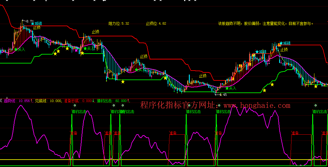 准备抄底: IF(趋势线<=10,50,0),LINETHICK1,COLORRED;