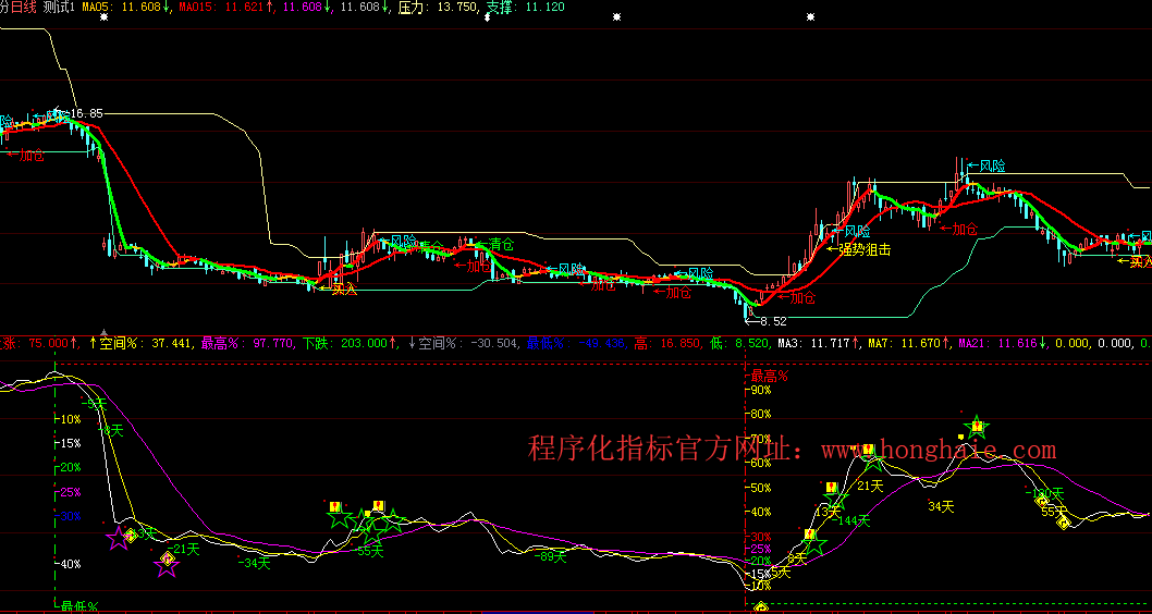 DRAWTEXT_FIX(C>O,0.01,0.9,0,' 微信公众号:程序化指标 网址:WWW.HONGHAIE.COM '),COLORRED;