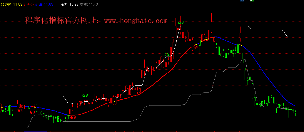 红升:IF(重心>=趋势线,趋势线,DRAWNULL),COLORRED,LINETHICK2;