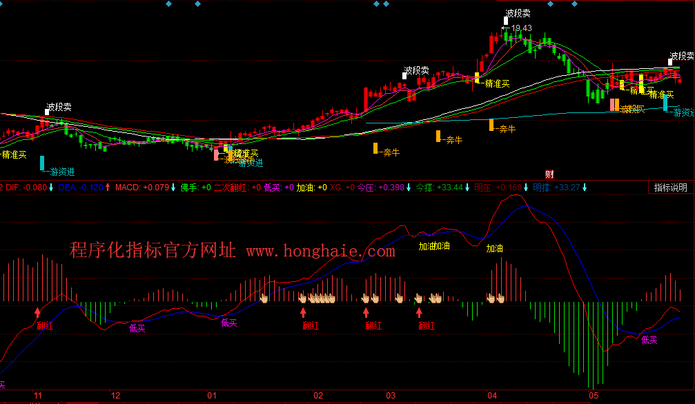 FH5:=FH1 AND FH2 AND MACD<0.10;//程序化指标官方网址 www.honghaie.com
