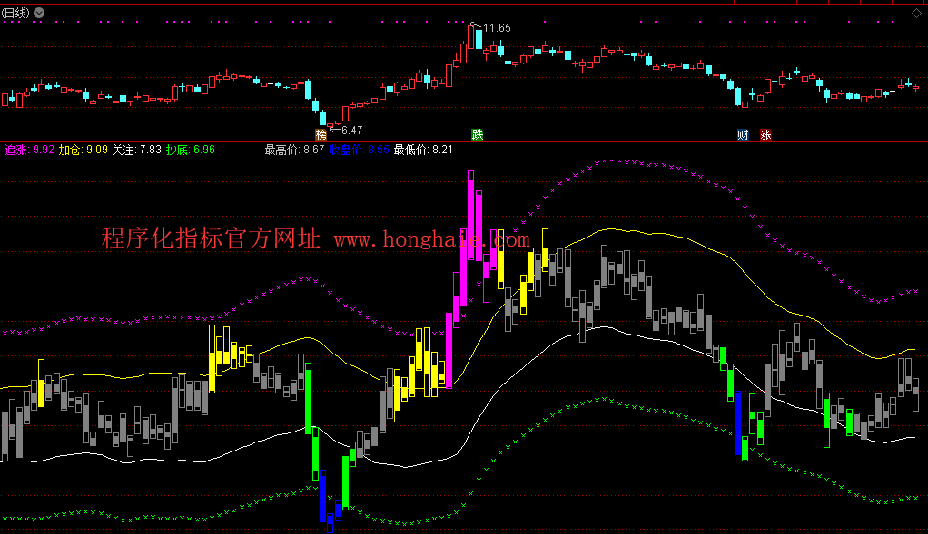 HDZF:=(HHV(H,20)-C)/(HHV(H,20)-LLV(L,20));{程序化指标官方网址 WWW.HONGHAIE.COM}