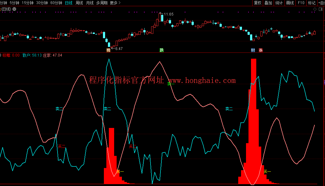 第二买点:DRAWTEXT(CROSS(庄家,散户) && 庄家<50,30,'买二'),COLORRED;