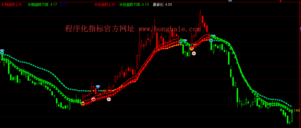 DRAWICON(LS,趋势线*1.005,2);{程序化指标官方网址 WWW.HONGHAIE.COM}