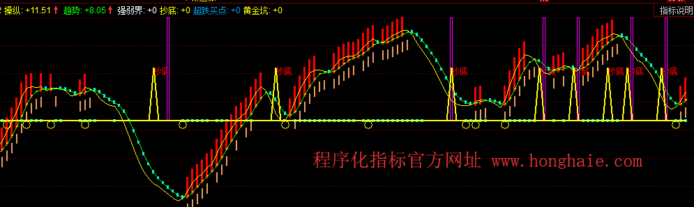 抄底: IF(TROUGHBARS(2,5,1)=0 AND HIGH>LOW+0.01,20.80,0),coloryellow ,LINETHICK2 ;